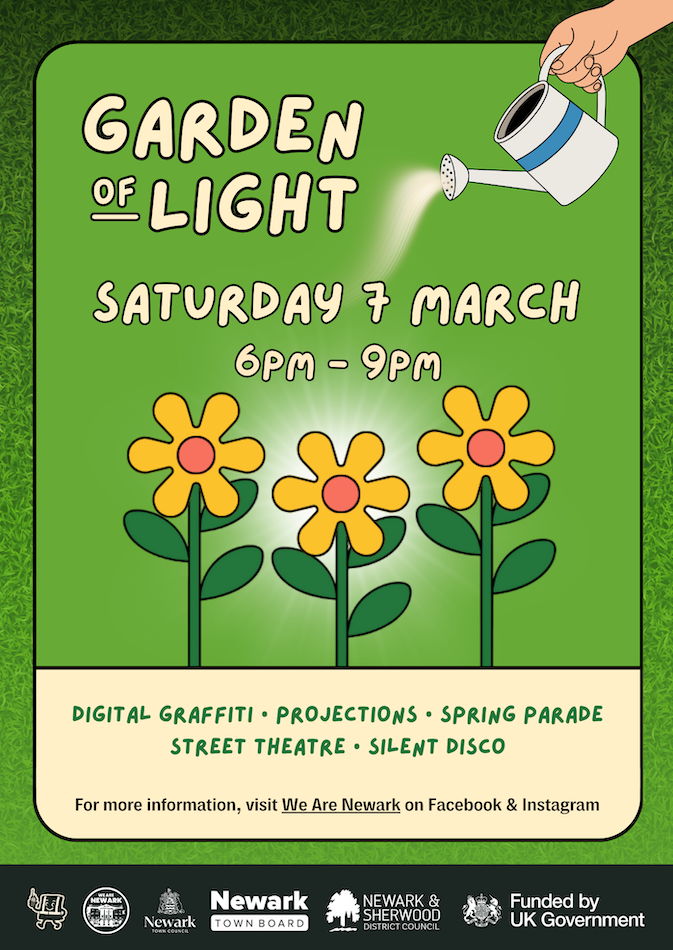 The Garden of Light is being delivered by Checkmate Productions as part of the Newark Cultural Heart Initiative, funded by the UK Government’s Local Regeneration Fund. The programme is overseen locally by the Newark Town Board and administered by Newark and Sherwood District Council. The Garden of Light event is supported by We Are Newark, a community platform established to help deliver, promote and connect the work of the Newark Town Board and community groups across Newark.